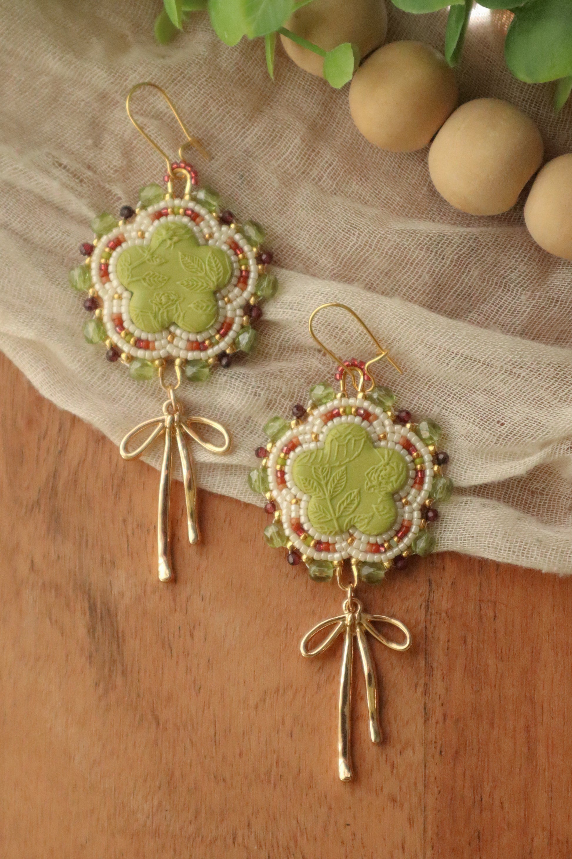 Inspired by crisp autumn days, these earrings showcase chartreuse polymer clay cabs that are beaded with cream luster beads and a rich brown-red gradient. Edged in olivine fire polished glass beads and garnet gemstones and finished with beautiful gold bows.